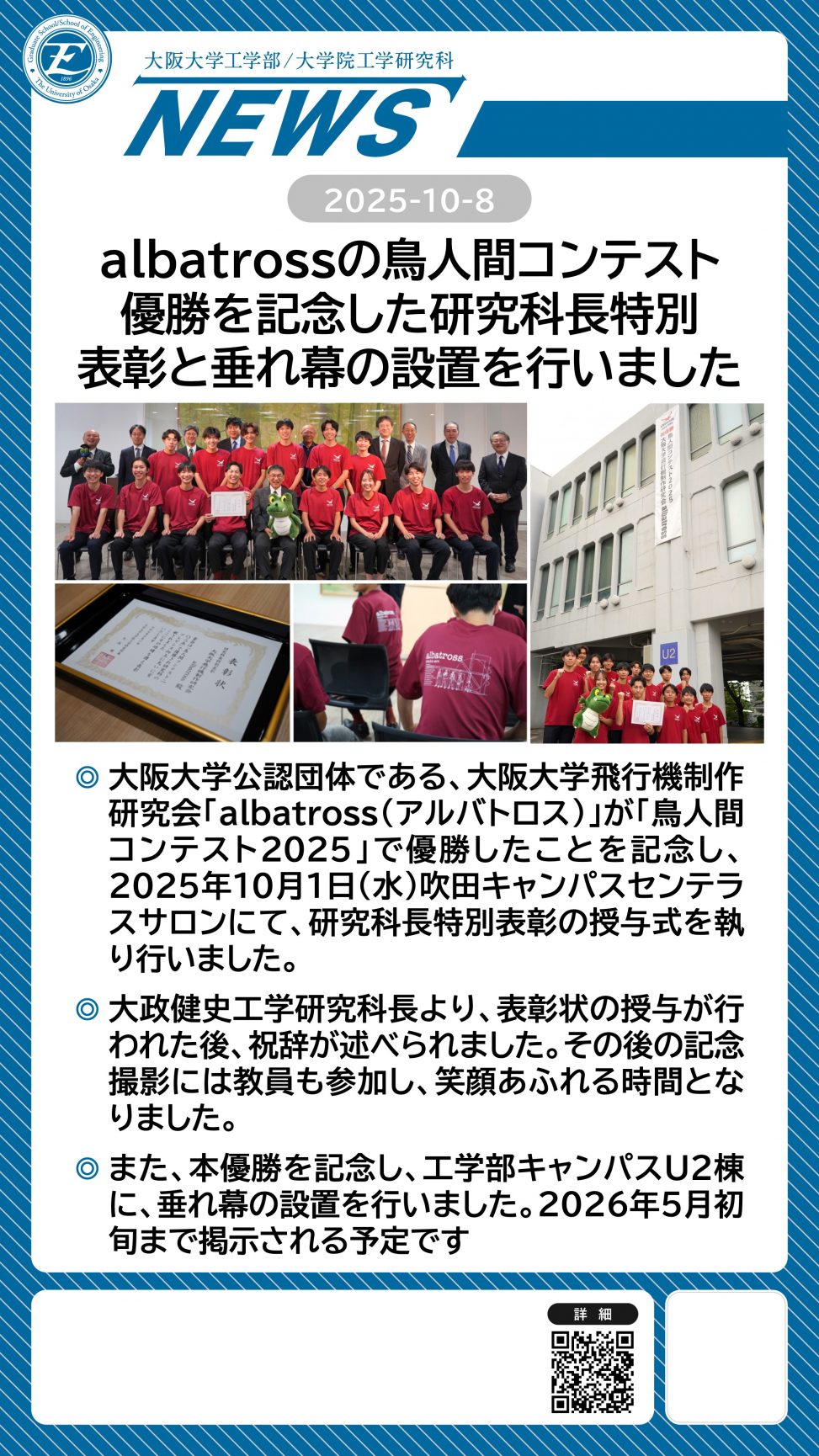 albatrossの鳥人間コンテスト優勝を記念した研究科長特別表彰と垂れ幕の設置を行いました 詳細ページ https://www.eng.osaka-u.ac.jp/ja/topics/news/27068 2025年10月8日 投稿先 NEWS ← 過去の投稿へ 次の投稿へ →